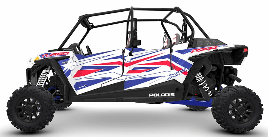 Looking for graphics to complete the look on your 2019 RZR and color ways for your Pro Armor RZR XP4 Turbo Traditional Paddle Latch Doors. Look no further to a color and theme matched White Lightning LE graphics kit. Consists of a White/Red/Blue color scheme this graphic kit will match the colors on your White Lightning LE XP4 Turbo. Made from Arlon brand vinyl and backing for a strong application and withstand elements and fade.