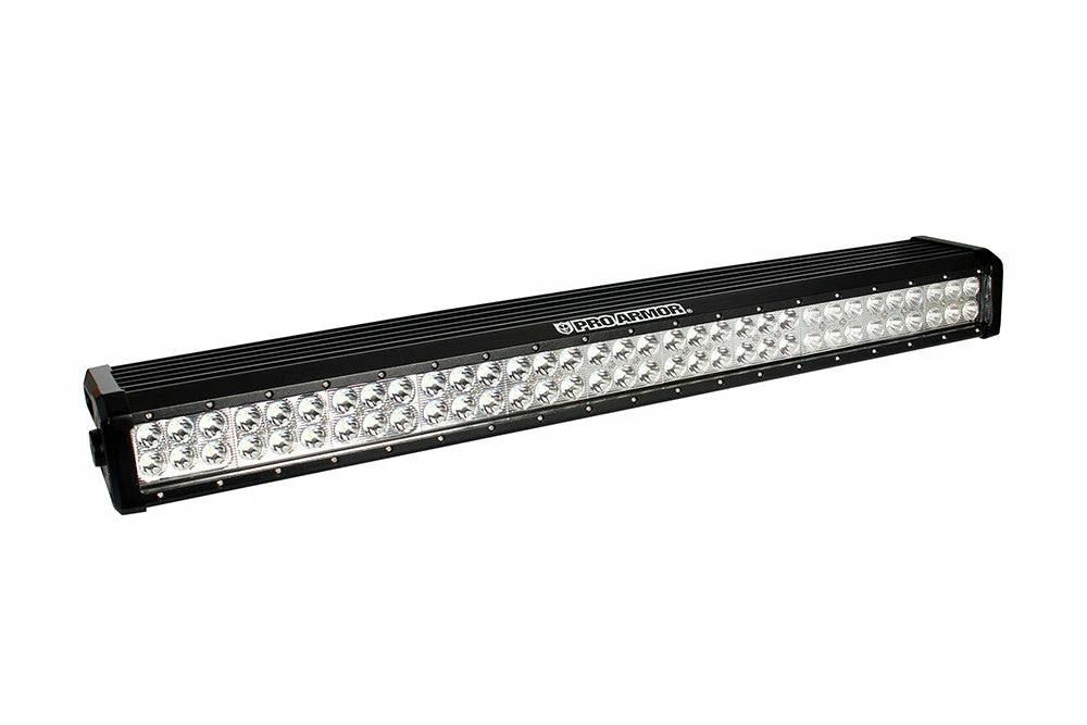 Pro Armor 30″ Dual Row Off-Road Combo SPOT & FLOOD light bar. Light weight with the highest quality 3 watt CREE LED lights. High output 13,860 lumens. Bezel-free and IPX67 certified waterproof and rustproof design. Wiring with Deutsch quick disconnect and hardware included.”13,860 Lumen combination spot and flood beam patterns”},”Precision Cast end panels and Bezel Free design that is certified waterproof and dust-proof”},”Highest quality 3 watt CREE LED’s Included wiring with Deutsch quick disconnect and stainlessL-Shaped Mounting system Hardware Included”},Installation Instructions:https://www.proarmor.com/en-us/shop/accessories/exterior-accessories/light-bars-cube-lights/30-combo-spot-flood-led-light-bar-dual-row-with-roof-mounts/?pfm=Browse#content