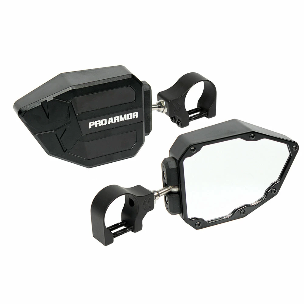 Pro Armor Side View Mirrors are a useful and stylish addition to your SXS. Constructed with a lightweight polymer material for the body and a high grade aluminum bezel they are designed to be strong and lightweight adding visibility to your ride. The unique design means that they are fully adjustable and have a break away feature which allows you to control the resistance when struck by an object rock or branch. This prevents damaging or crushing the mirror body.Installation Instructions: https://www.proarmor.com/en-us/shop/accessories/exterior-accessories/mirrors/side-view-mirrors-1-75-clamp/?pfm=Browse#content