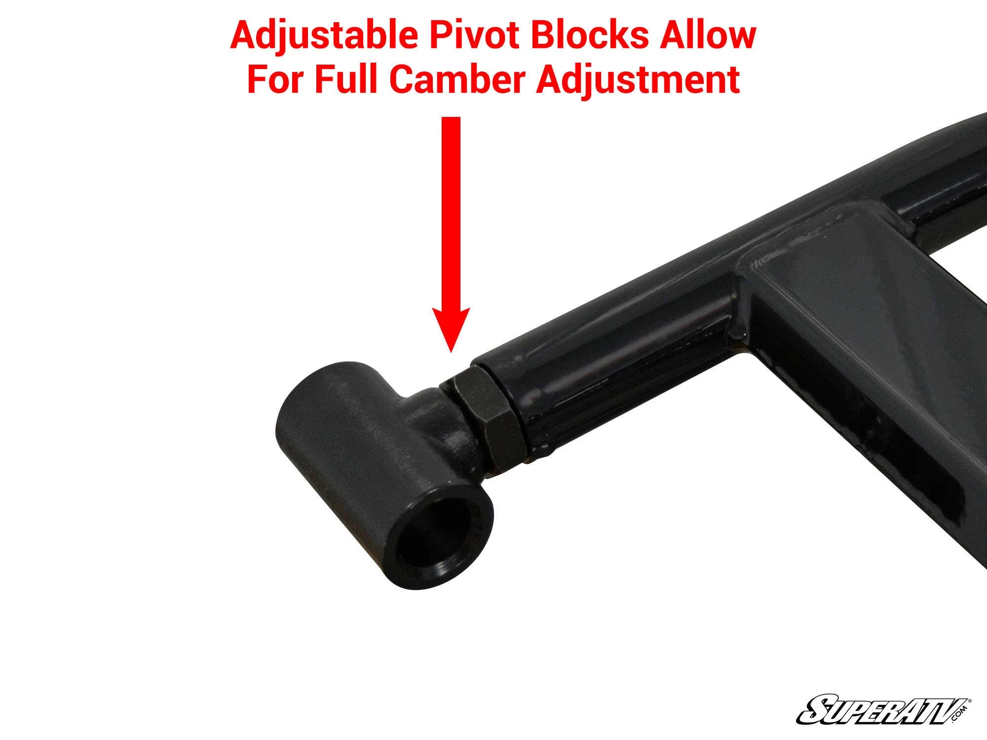 What does this mean for you? SuperATV A-Arms feature the industry leading Adjustable Lower Ball Joints The high-clearance A-arms in the Long Travel Kit for the Arctic Cat Wildcat Trail feature industry leading Adjustable Pivot Blocks. Unlike others, SuperATV arms allow you to adjust your alignment. Adjustable pivot blocks eliminate the worry of premature tire wear that can come from the addition of a lift kit, new shocks, or larger tires.