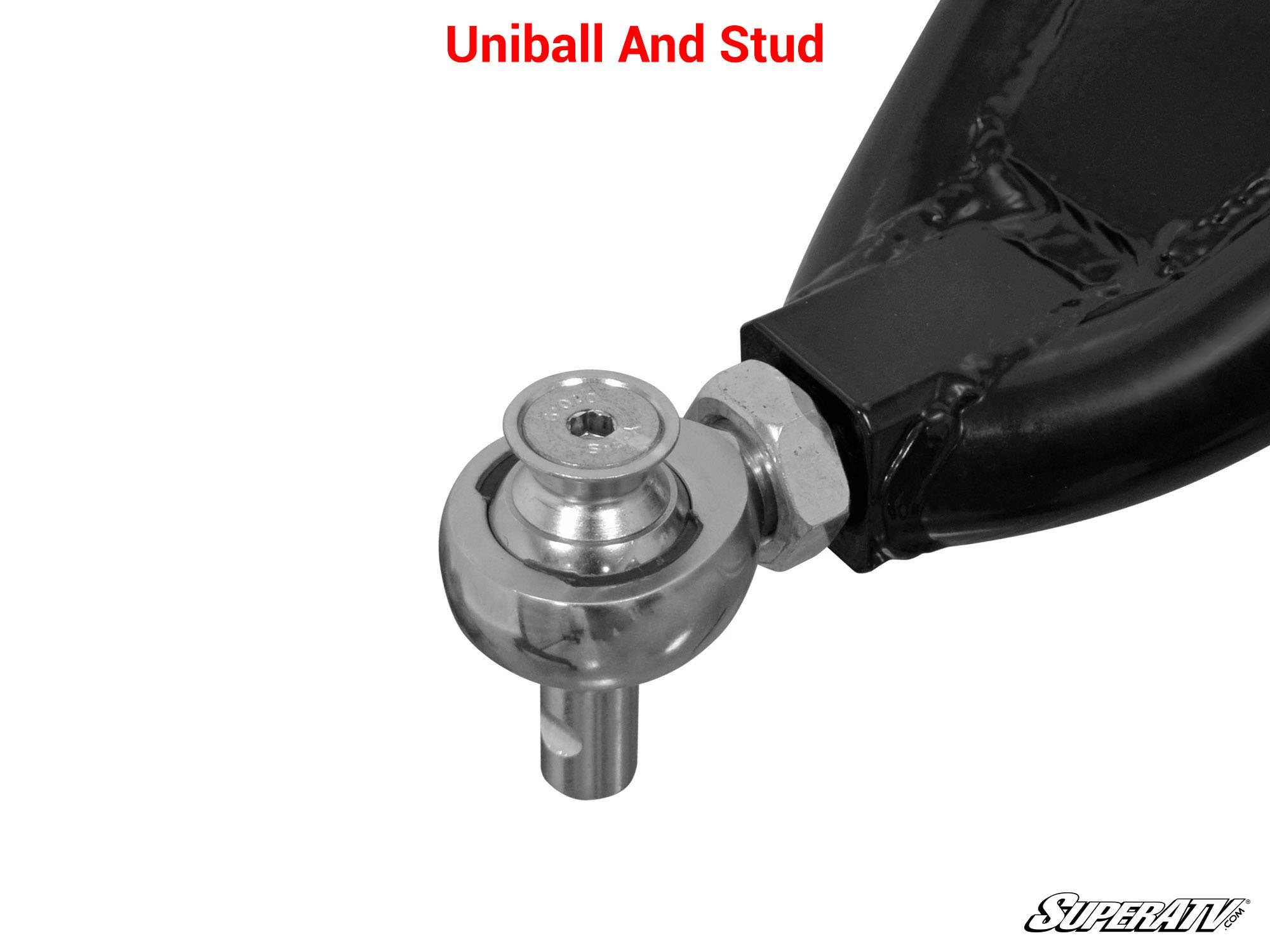 SuperATV spared no detail in the creation of these arms and tip to tip you will see strength, style, and features that are unmatched in the market. We know ball joints can be a weak link. To ensure a bullet proof design, our A-arms are paired with a 4130 chromoly uniball. Match top of the line materials with a stud that is 140% larger than OEM, and you’ve got a set of arms that are Built for Battle. Important to note that the SuperATV uniball studs are not necked down; they measure 17.9 mm compared to the OEM ball joint stud at 12.7. With a larger stud and meticulously heat treated materials, you have a uniball that is 400% stronger than your stock ball joint.