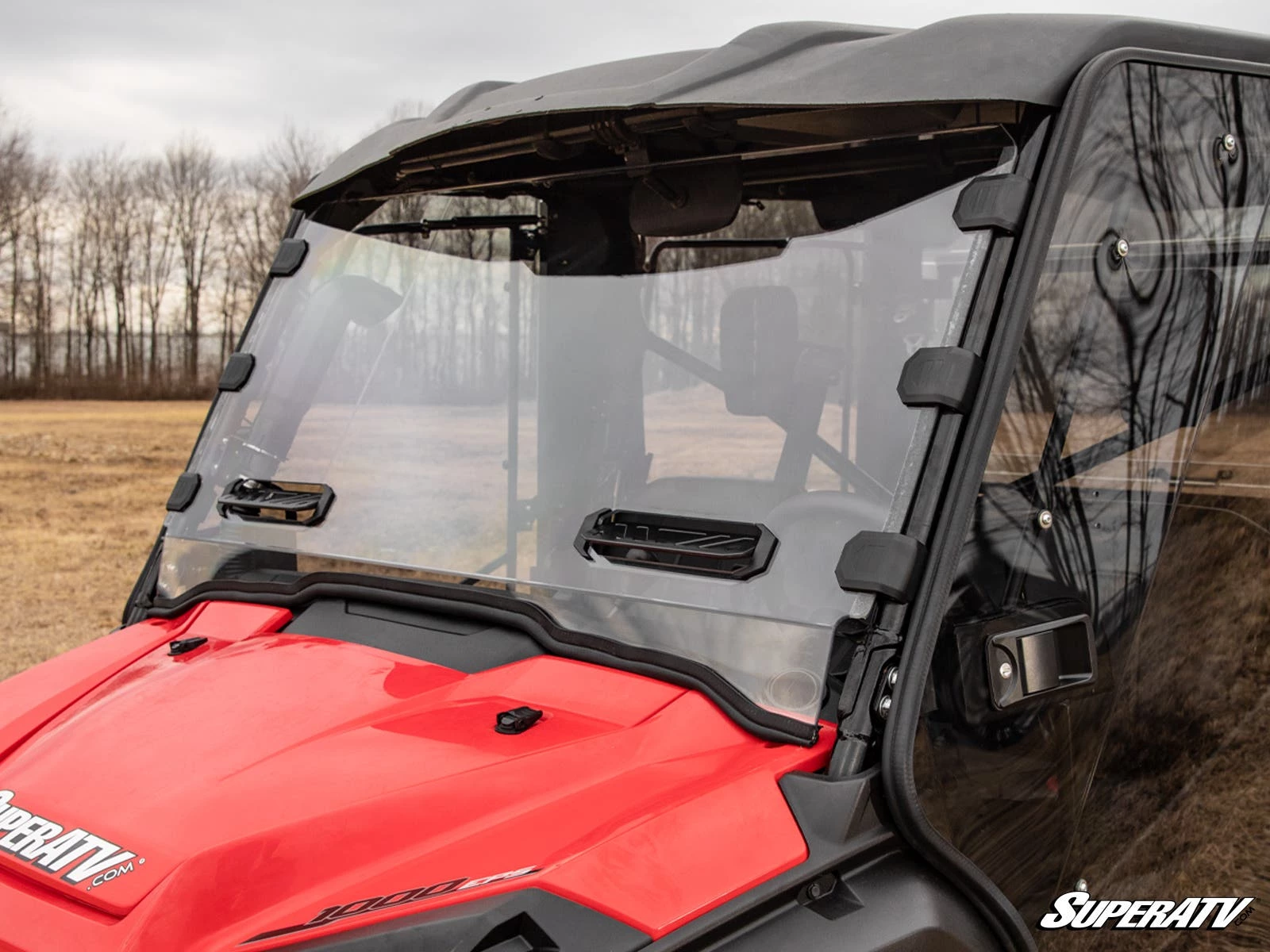 You need the full protection from the elements that a front windshield gives you, but you also want total airflow control for when the ride gets warm. Thatâs why you need SuperATVâs Honda Pioneer 1000 Vented Full Windshield on your rig. The 1/4â polycarbonate is the toughest in the industry, and our one-of-a-kind adjustable BreezeRite vents give you the power to stay comfortable.