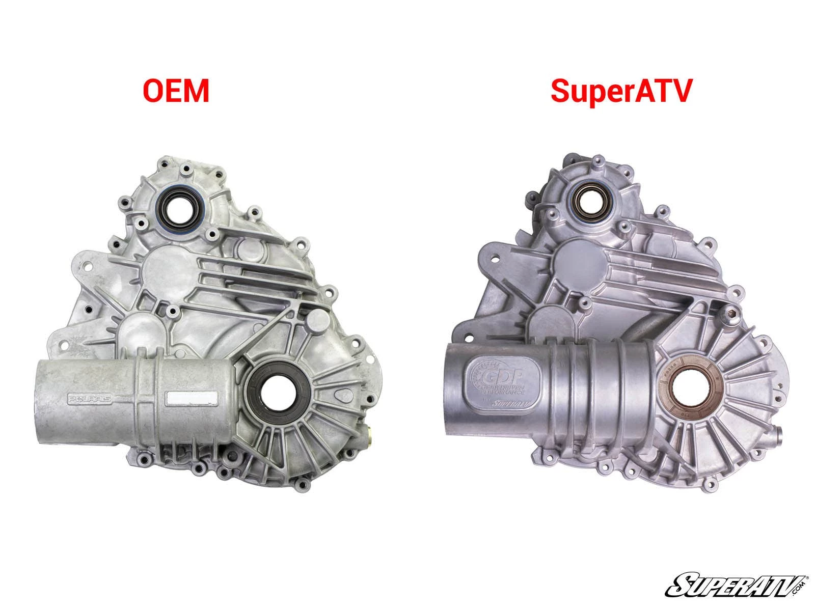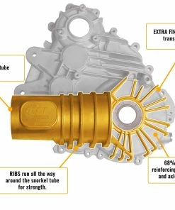 Our cast aluminum case is strategically strengthened to address the OEM weak spots while only adding about one pound of extra material. The snorkel tube and axle output utilizes 68% more metal than stock, and they’re designed with additional support ribs and gussets. They’re stronger and make your transmission run cooler too—a win-win for your next ride.