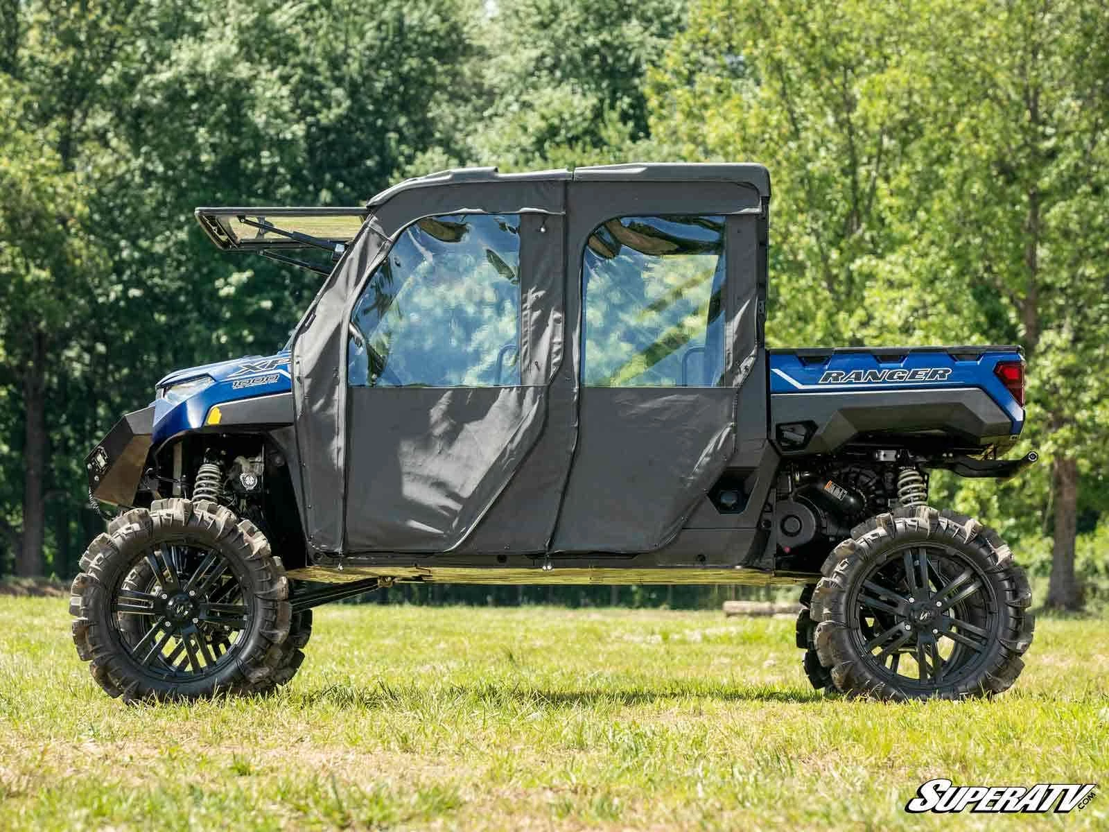 These Polaris Ranger XP Crew soft doors are designed to let you adapt to changing conditions. So whether your early spring ride is warmer than you thought or your summer cruise gets interrupted by rain, you’re ready for anything. The windows unzip and roll up to give you the perfect amount of air without compromising protection. Or you can go to a fully open cab by unzipping and removing the doors completely. Whatever the weather does, these doors can handle it.