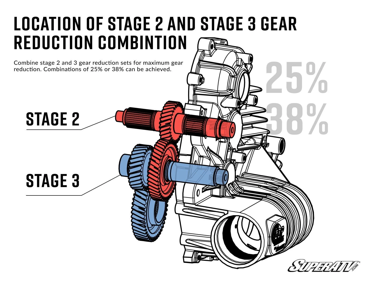 If you want to get the most out of your machine and eek out every last ounce of power from your engine, combine our Stage 2 and Stage 3 gear reductions for a 25% or 38% gear reduction. With all that power, you can plow monster tires through mud, rocks, and hills like nobody’s business.