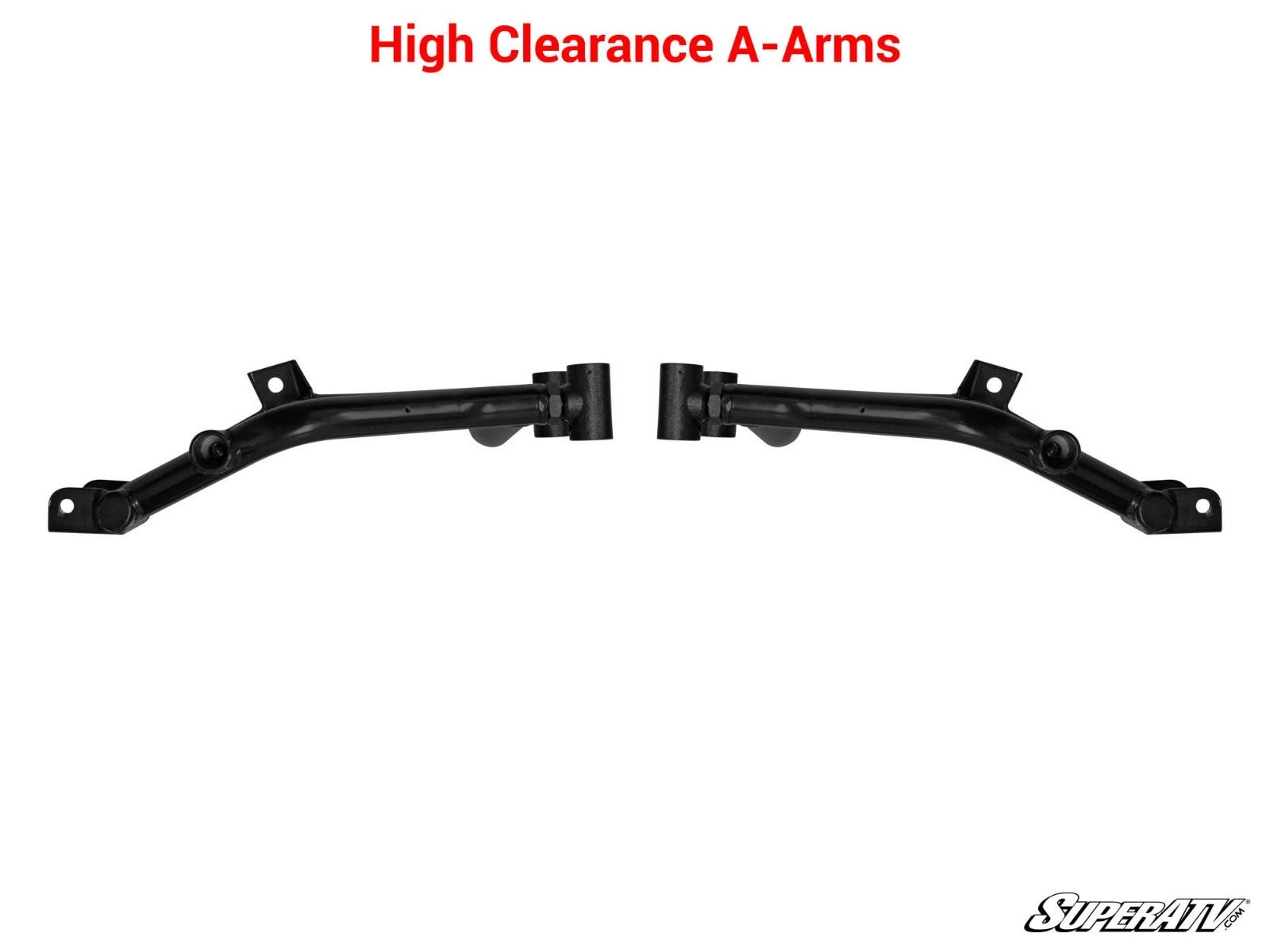 We use a unique dual-bend design on the lower pair of A-arms to raise the profile of them by 1.5 inches. They also come with a 1.5” rear offset which lengthens your wheelbase, gives you increased stability, and increases your tire clearance. You can run larger tires when paired with our front offset A-arms. Bigger tires give you even more ground clearance all without a lift!