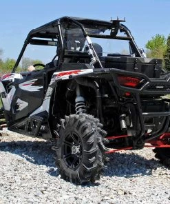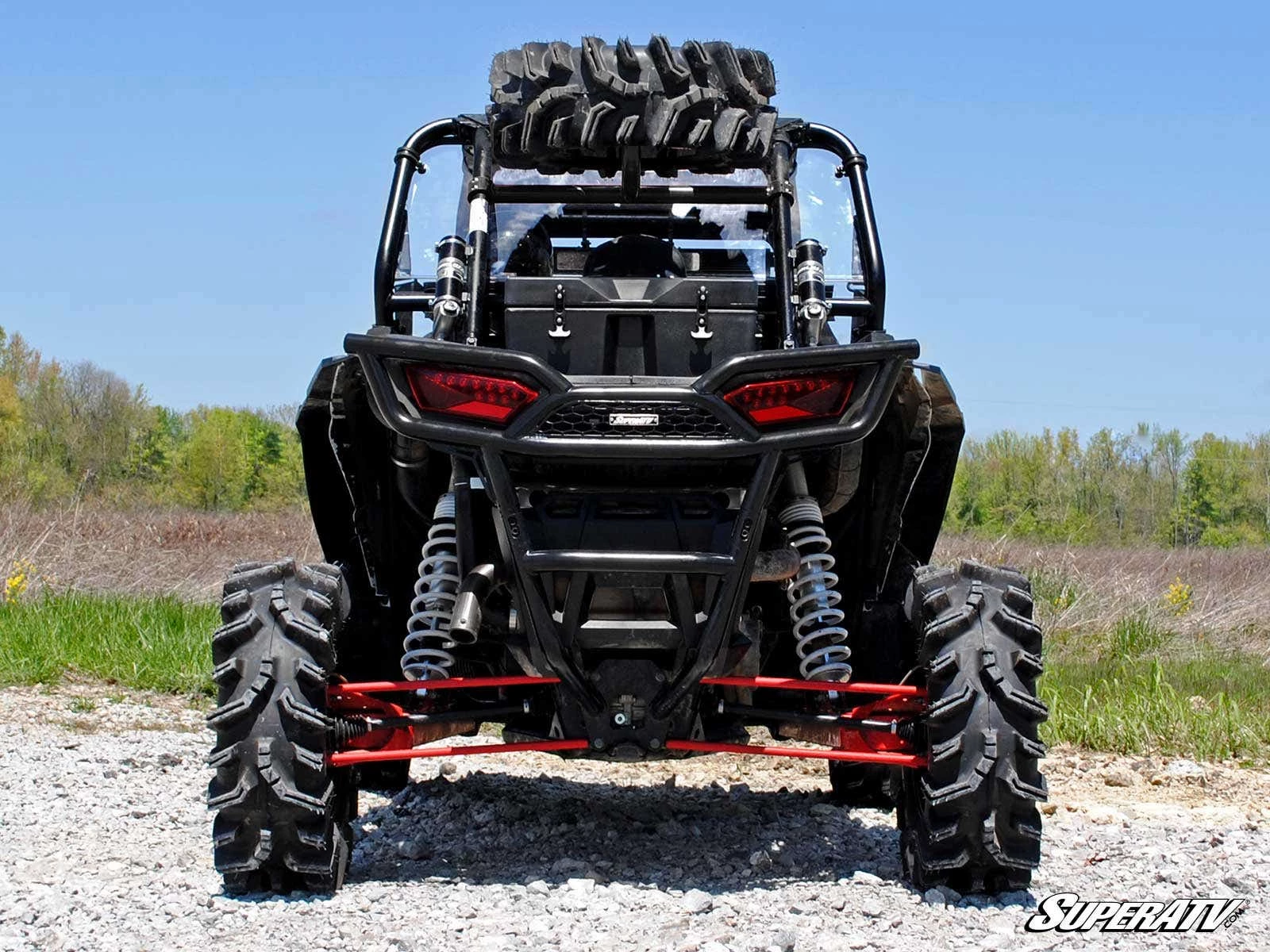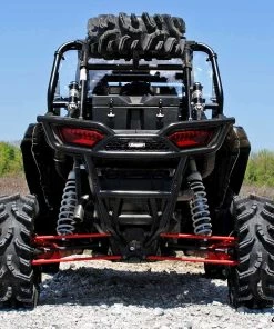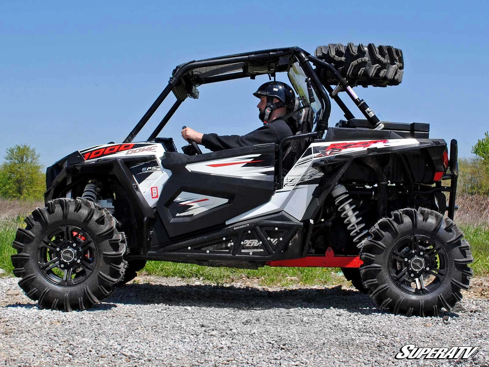 Don’t risk riding without a spare! SuperATV’s RZR XP Turbo spare tire carrier is the perfect addition to give you peace of mind while cruising the trails. Designed with style and performance in mind, we’ve carefully positioned the spare tire carrier to ride higher than the driver’s line of sight. This single piece design mounts directly to the factory roll cage and can carry up to a 30″ tire. Utilizing our slip-resistant clamps, there is no need to worry about rattle or movement from the carrier while riding. Unlike others, SuperATV’s RZR Turbo spare tire carrier provides the rider with full access to the bed without the hassle of having to swing open, or remove the mount. And, there’s still plenty of room for your SuperATV Cooler / Cargo box.