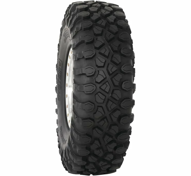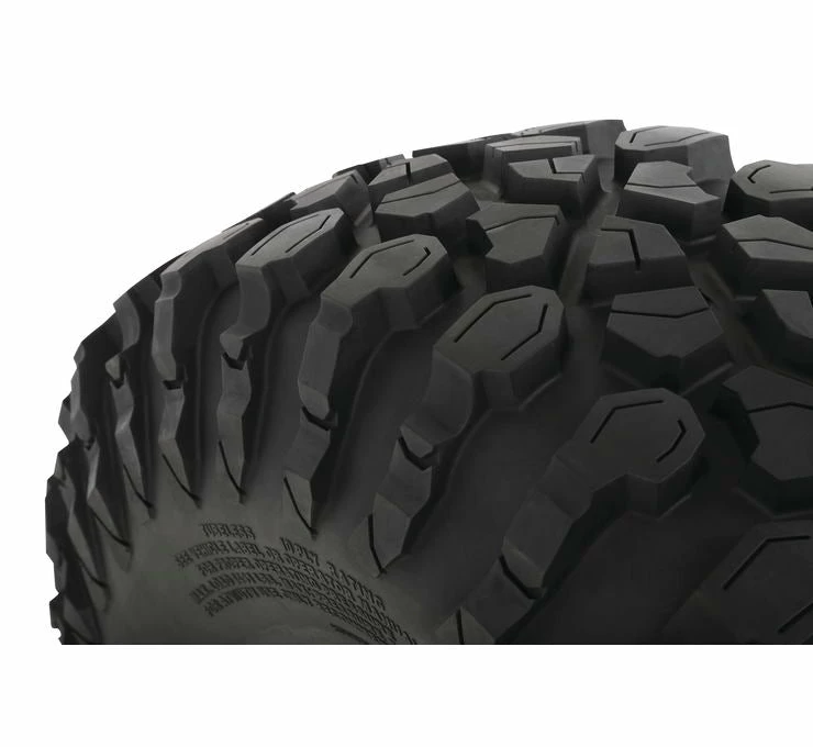 • Mixed terrain tread pattern; tight center-block spacing & open channel shoulders excel on both hard pack & loose terrains.
